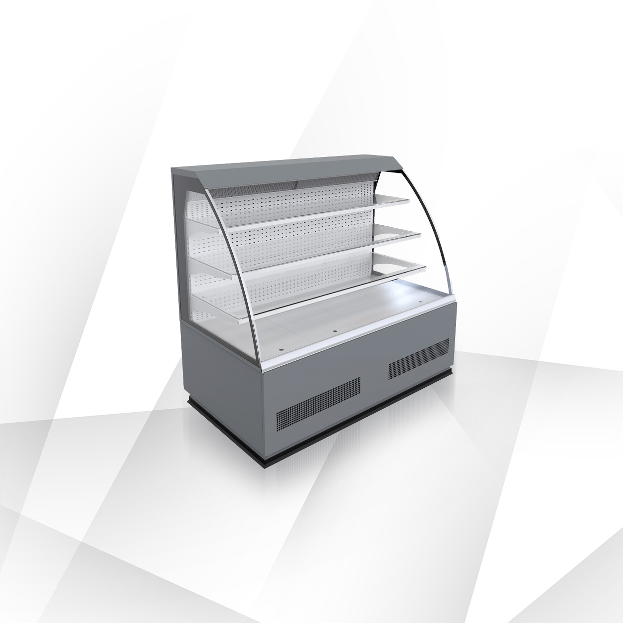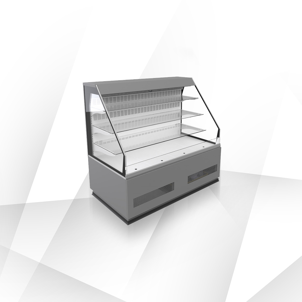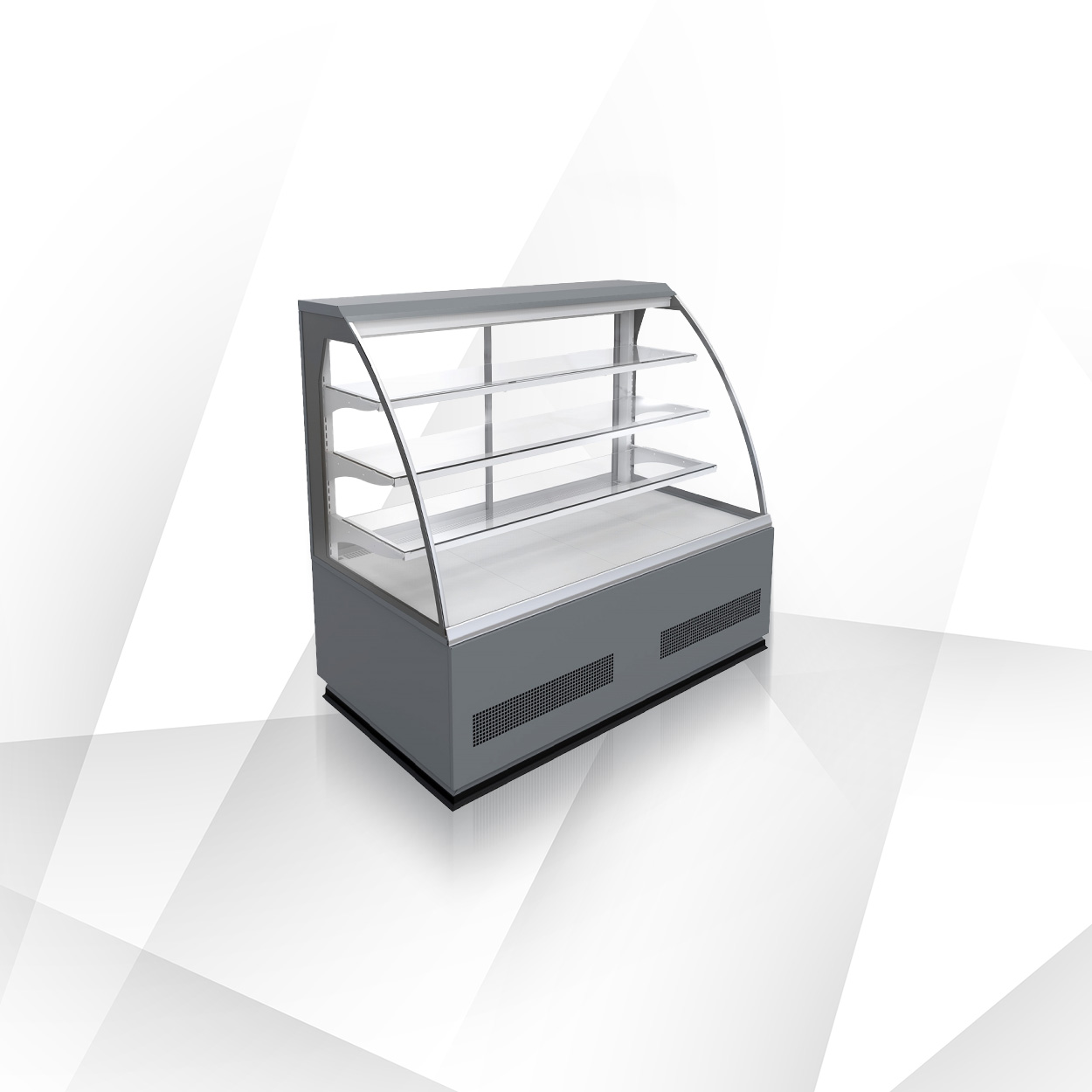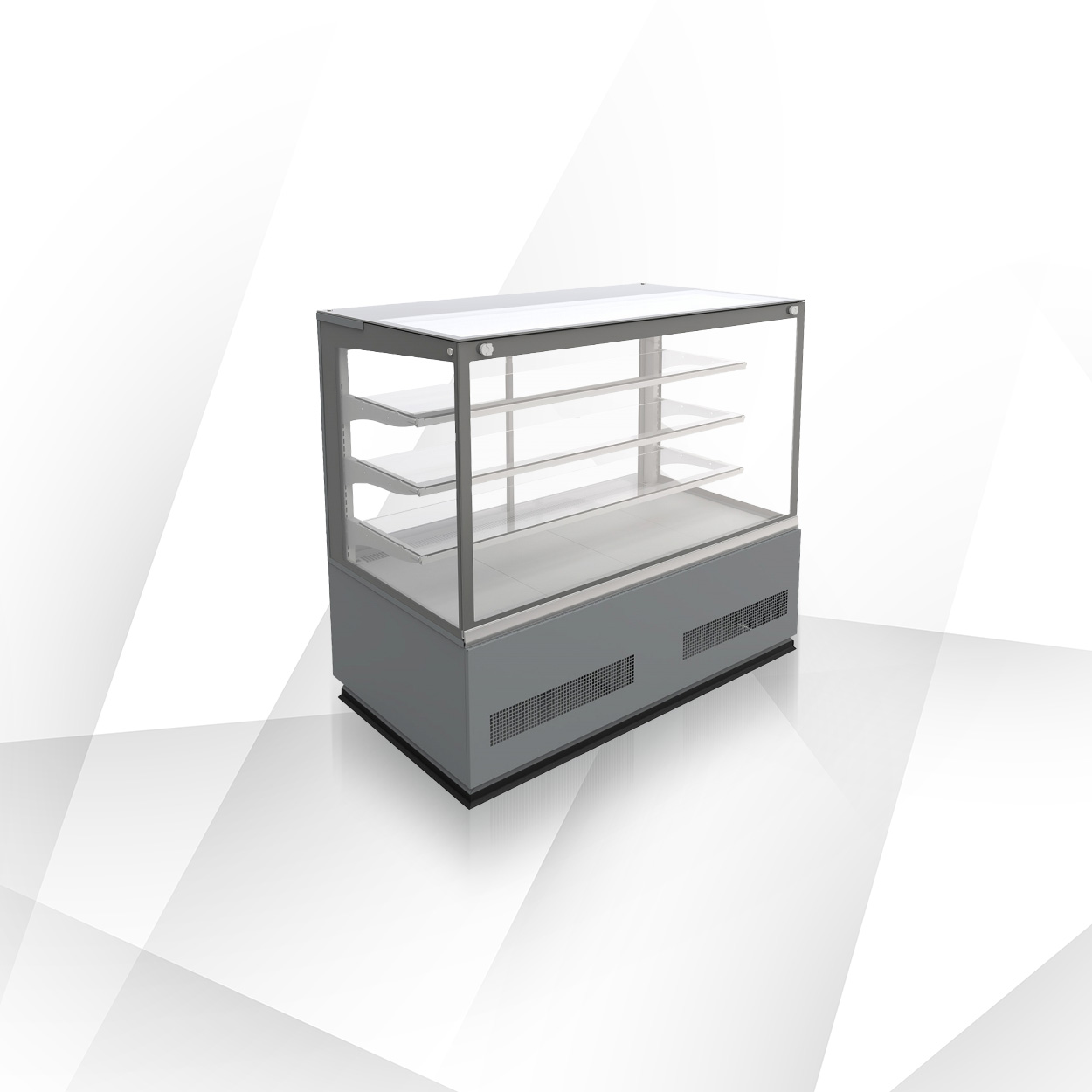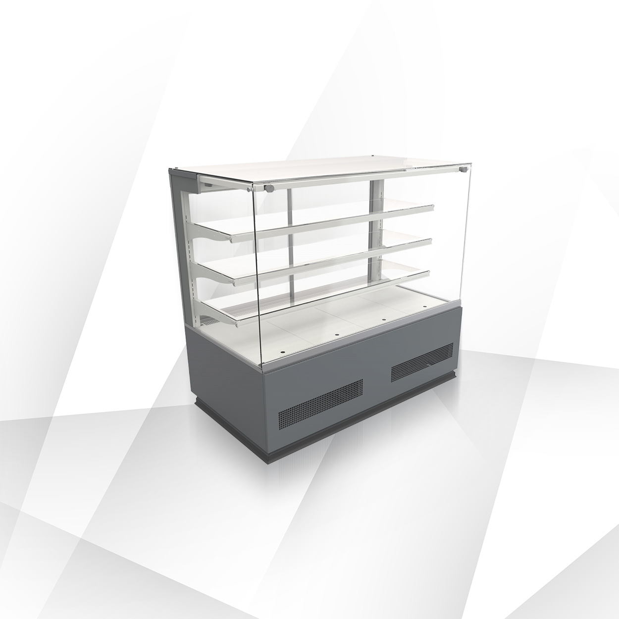 Seria Elegant/Etna została zaprojektowana do estetycznej ekspozycji ciast, deserów i produktów cukierniczych. Standard obejmuje 3 półki szklane na stelażu + dolna półka z blachy cynkowanej, stelaż i dolną ekspozycję w kolorze szarym (RAL 7004), tylne drzwi przesuwne (w niektórych narożnikach rozwierne), boki zintegrowane z sitodrukiem oraz LEDit (barwa WW‑2) jako oświetlenie górne i półkowe. Dostępne są wersje z szybami podwójnymi giętymi/ prostymi, niskimi burtami oraz roletą mechaniczną do samoobsługi (wybrane modele).