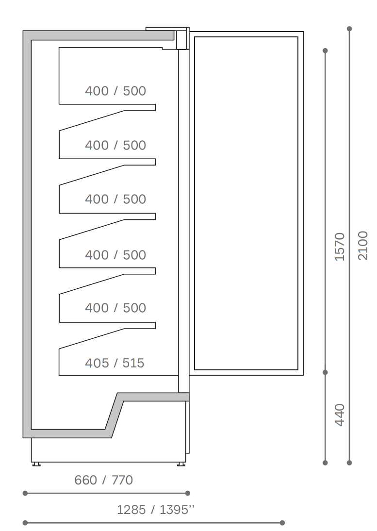 • Wymiary: długość 1250 / 1875 mm; głębokość 660 / 770 mm; wysokość 2100 mm.