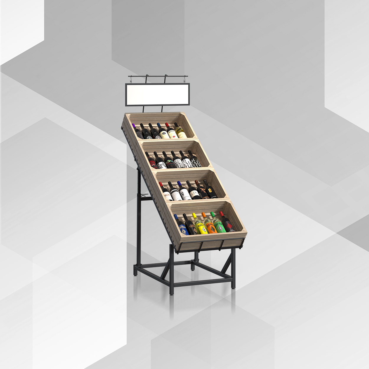 - SELECTED ALCOHOL Typ 1 — przyścienny regał z drewnianym pokryciem; głębokości 400–600 mm; baldachim reklamowy.